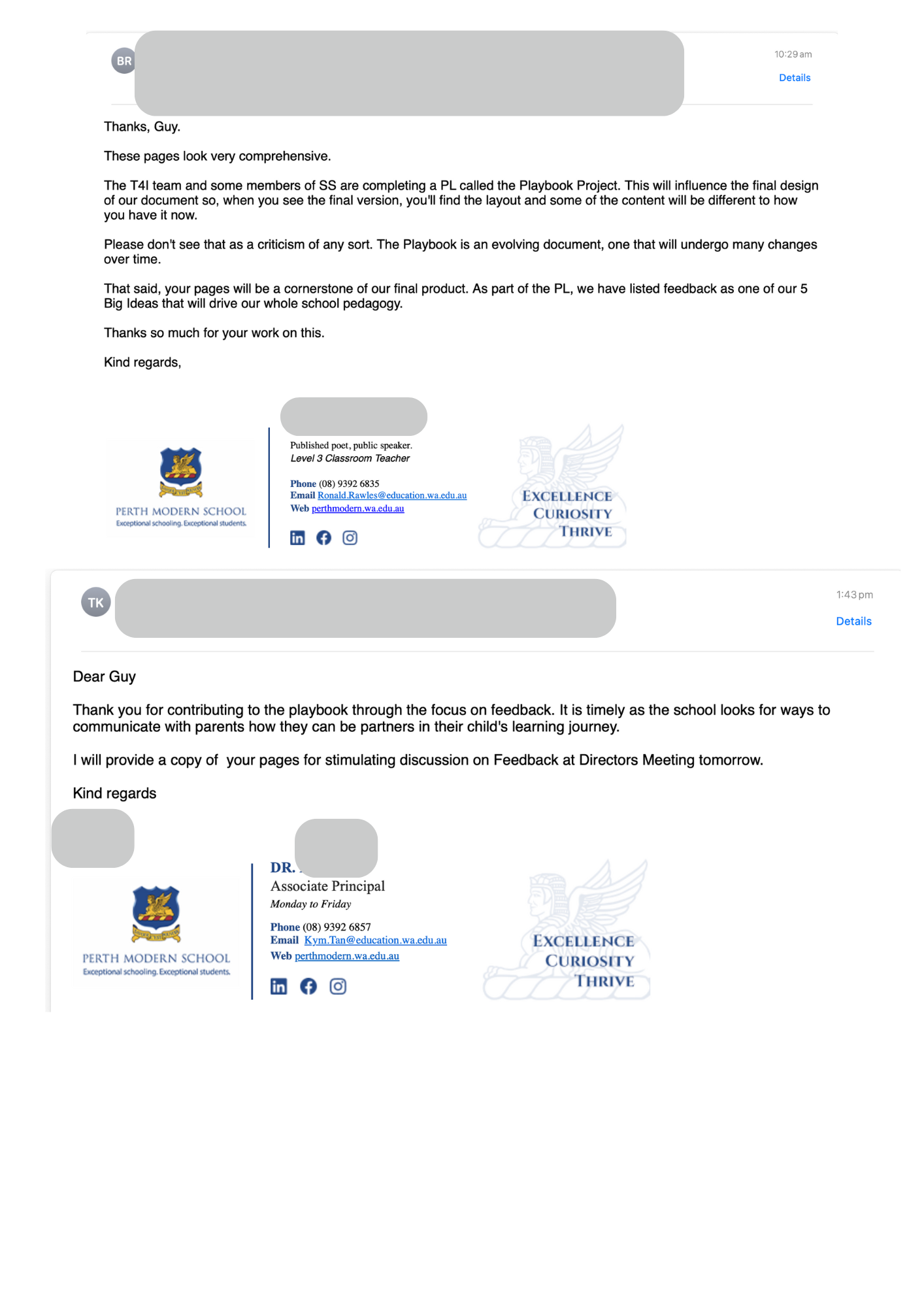 The emails from my Head of Learning Area and Associate Principal further contextualise the impact of this contribution. They acknowledge the clarity, usefulness, and influence of my pages—recognising them as a cornerstone of our developing Instructional Playbook and noting their relevance for leadership discussions at the Directors’ Meeting. These communications demonstrate how my work supported colleagues in applying timely, effective, and appropriate feedback strategies, directly aligning with the highly accomplished descriptor of AITSL 5.2.